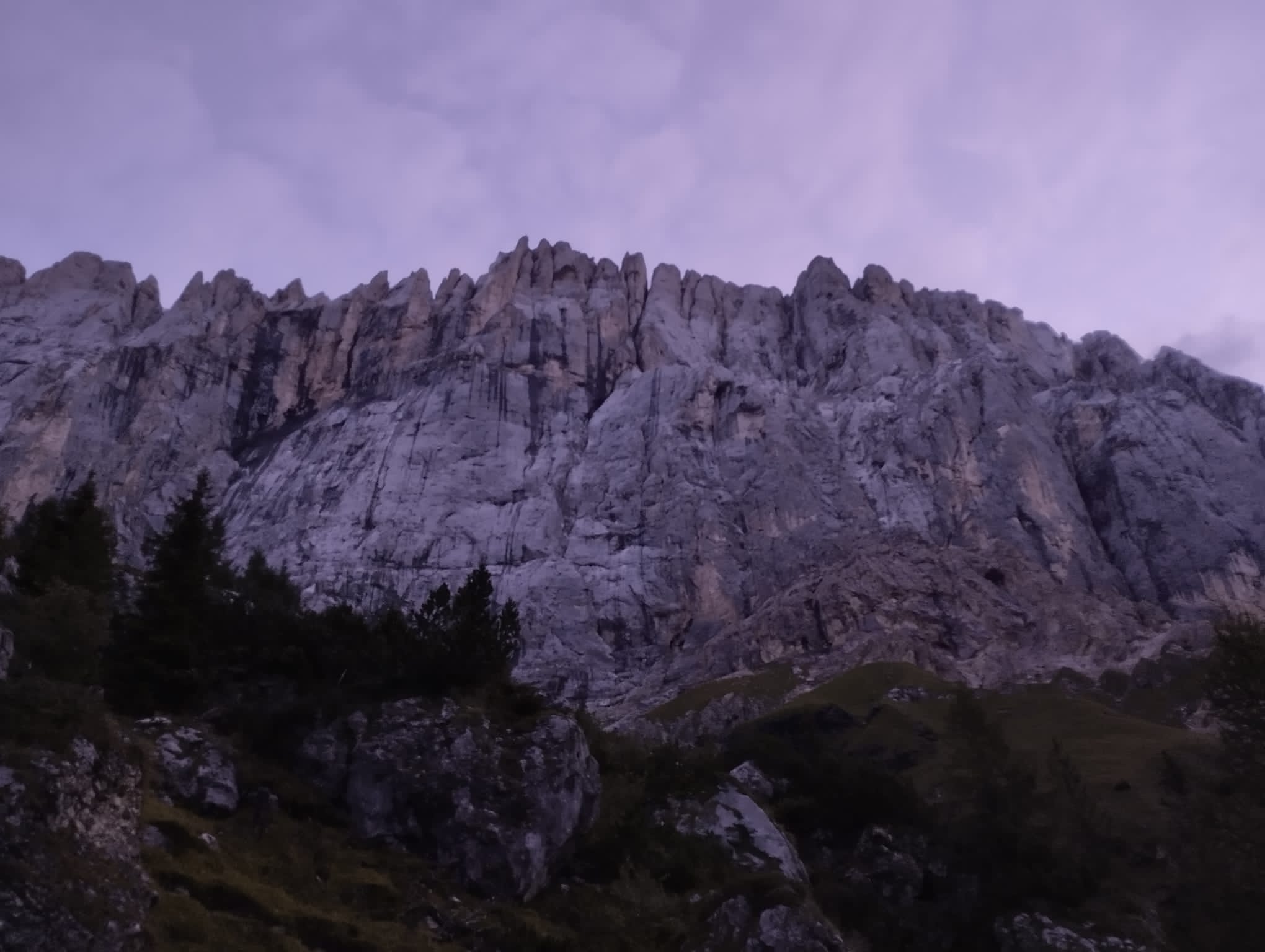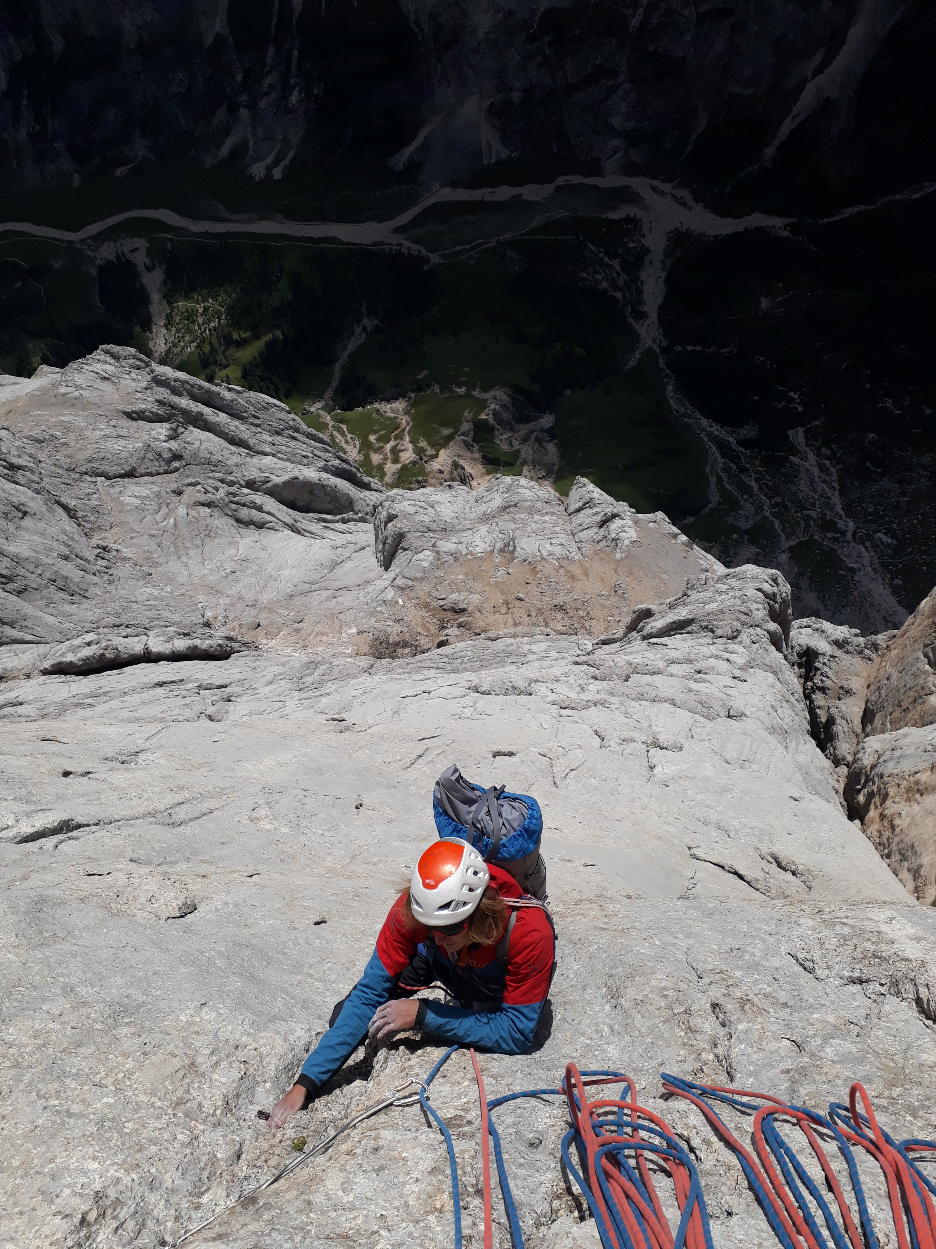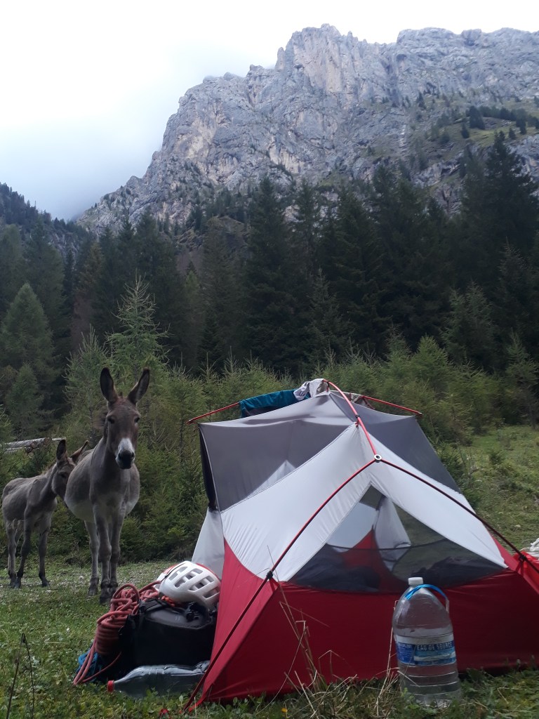 Notre petit groupe s’est séparé, Mag et Manon devant rentrer en France. Elles ont ramené avec elles la précieuse Dacia, tandis que Nathan et moi repartions en stop vers la Marmolada. On se cache dans un immense champ partagé avec des ânes et des vaches (élément de contexte important pour la suite de l’histoire) qui essaient de brouter notre tente pendant la moitié de la nuit. On rentabilise la journée de pluie du lendemain en allant visiter le refuge Falier sous la face sud, déposer du matos et repérer le départ de la voie du lendemain. Un article trouvé sur internet disait que Don Quixote sèchait très vite … La pluie s’arrête à 20h, on n’a cas essayer ! Le coup de pocker fonctionne, la voie est pratiquement sèche le lendemain et on se fait plaisir dans ces belles dalles. La descente en face nord se passe bien, on est pris en stop tout en haut des pistes par des employés de la station de ski qui nous reposent à notre bivouac et on rentre ravis et étonnés d’être là si tôt. La Marmolada, c’est un peu Céuse sur 800m, avec des lunules à la place des spits. On en redemande bien sûr ! On se motive pour les Temps Modernes ou Tempi Moderni, décrite comme une « classique extrême » (qui de nos jours est devenue une classique tout court) de la face sud. On en a marre de se lever tôt et toujours pas le budget de payer le refuge, alors on choisit la stratégie sur deux jours. On se laisse cueillir dans la première longueur qui a plutôt semblé 8a avec le sac, puis on déroule plus ou moins dans de belles dalles jusqu’au bivouac. Bonne surprise, des matelas sont posés à la vire intermédiaire, on dormira mieux que prévu 🙂