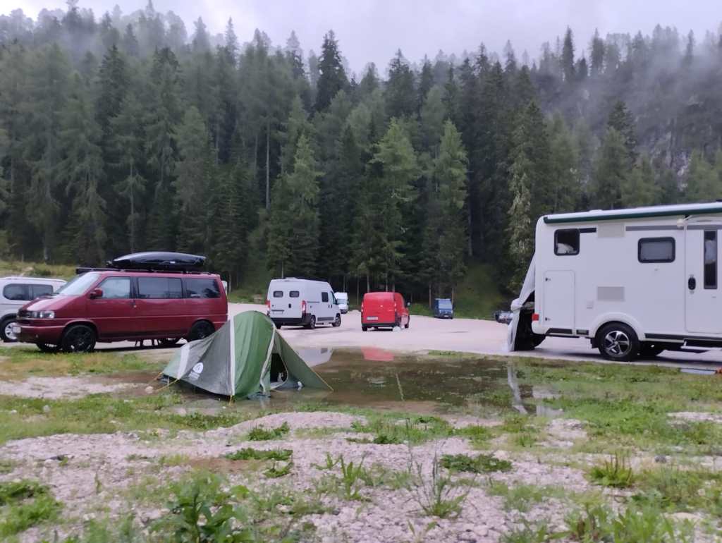 Le soir, on quitte le parking bondé des Tre Cime pour aller manger une pizza bien méritée et dormir à côté d’un lac un peu plus loin. On prépare les tente, les duvets … Il manque le duvet de Manon ! On se disait bien qu’on avait de la place dans la Dacia … C’est reparti pour un aller-retour où on trouvera miraculeusement le duvet, mis de côté et protégé de la pluie par un sac poubelle par des âmes charitables. Bref, notre niveau de fatigue commence a être inquiétant, on prend quelques journées de repos / trail / salle sous la pluie pour réccupérer.