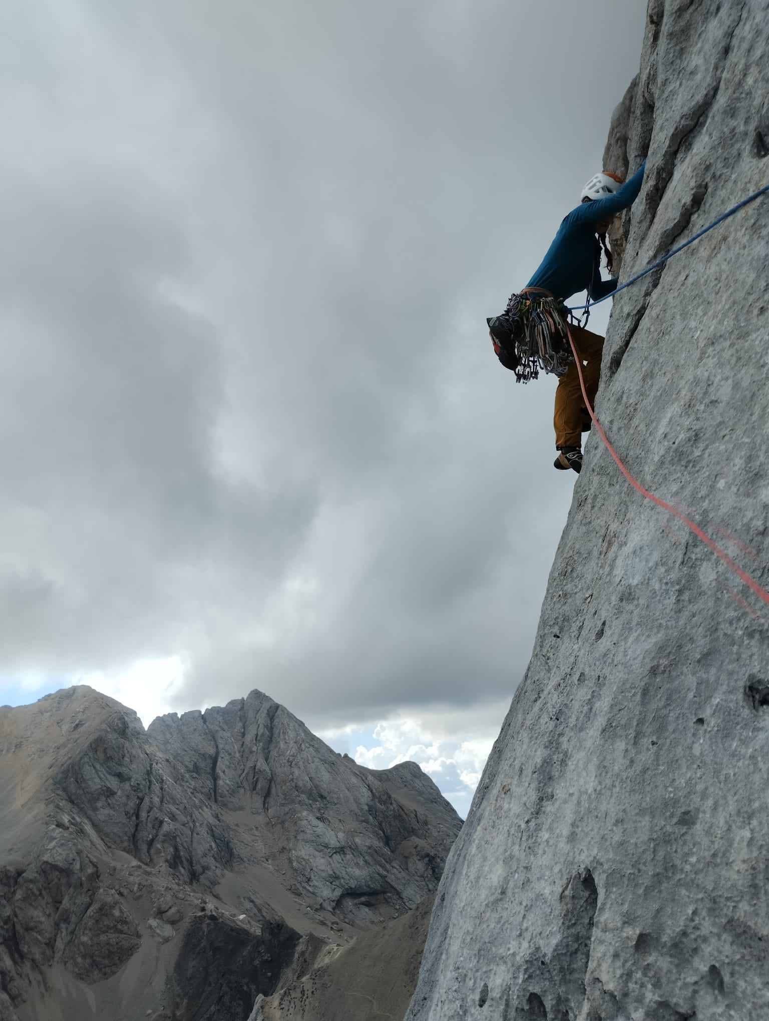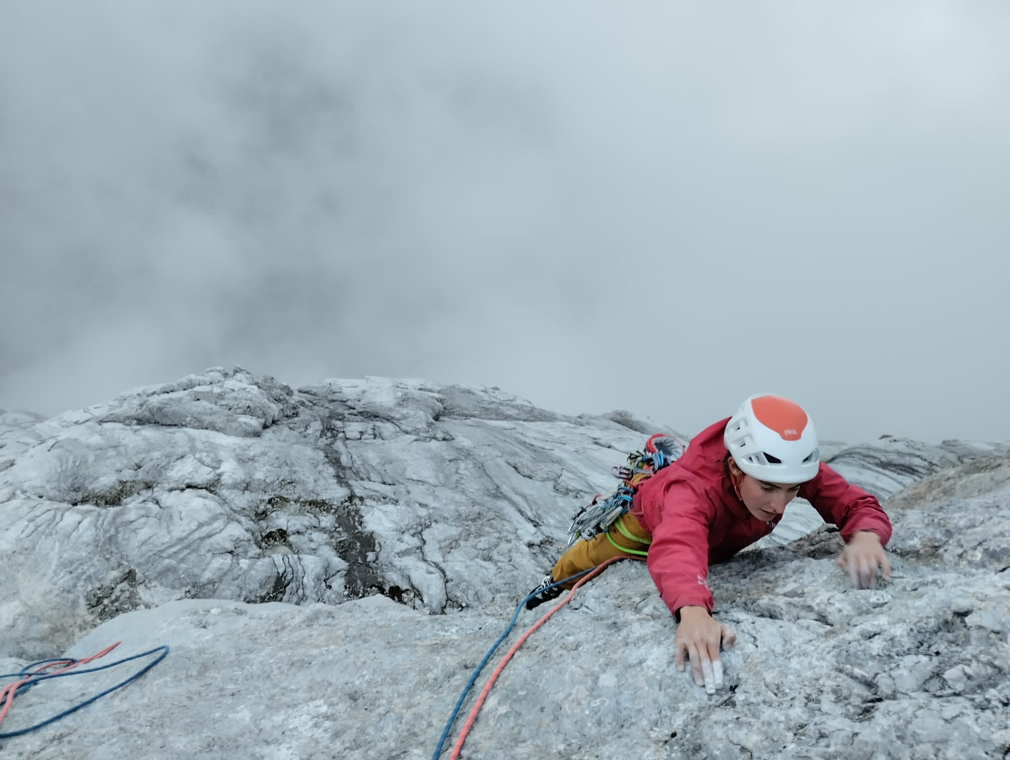 Un petit créneau météo se dessine pour le lendemain, on part pour l’historique voie Cassin à la Cima Ovest di Lavaredo. Ouverte en 1935 par Ricardo Cassin et Vittorio Ratti après que 27 cordées aient buté dans cette face nord très déversante. Ils ont trouvé la solution par quatre longueurs très gazeuses en traversée au-dessus des toits. Et bien, ça en dit long sur l’audace des anciens ! Ces longueurs sont maintenant grimpables en libre (7a max) dans un style moderne: des arquées dans du penché. Pour notre part, ça grimpe en libre, ou du moins ça essaie … Mais il s’agirait de ne pas tomber sur les vieux pitons tout de même.