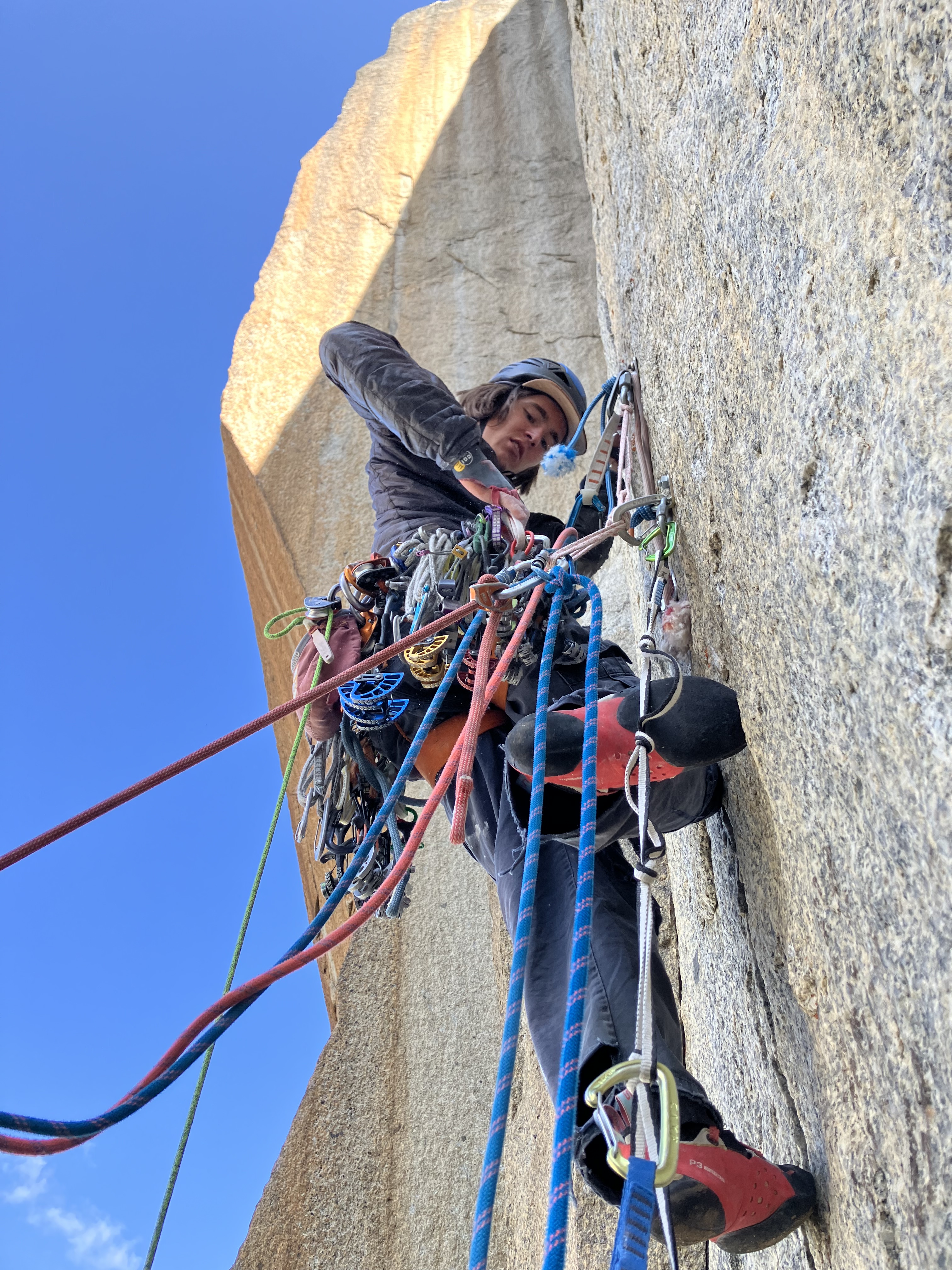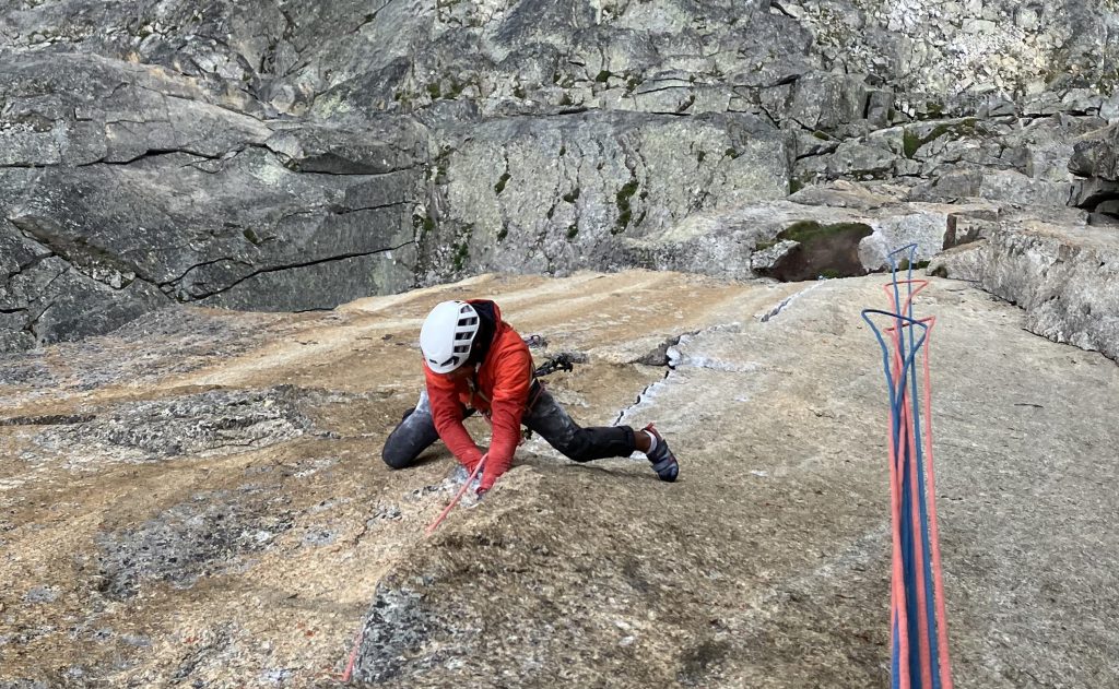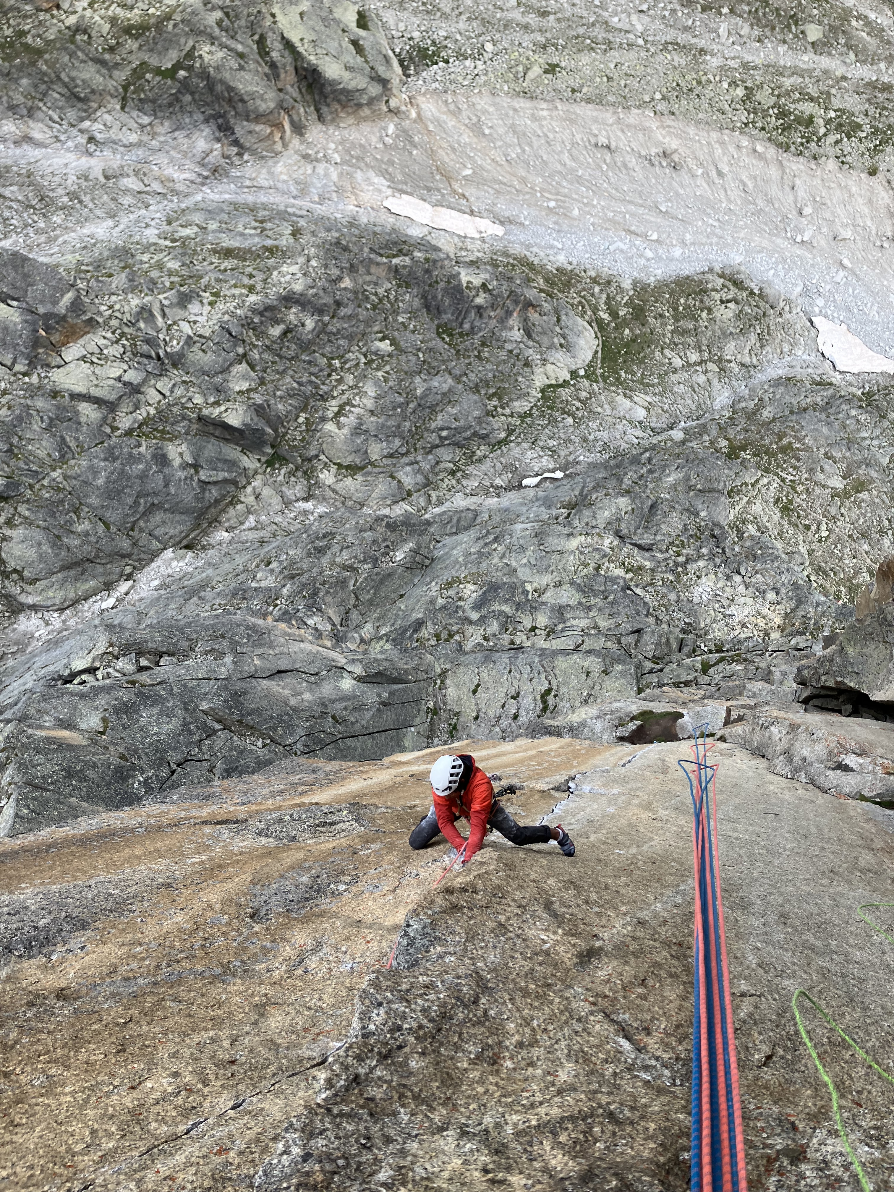Je laisse la place à Leo pour le grand 7c (taille #0.5 et #0.75, final en fissure fine). Fin de journée oblige, il fera la part belle à l’artif. Heureusement la vire de départ est idéale pour faire la sieste en attendant 🙂 En moulinette, on peut bien avancer mais on se fait vite rattrapper par sa rési quand on n’est pas rodé au style. Les coincements ne sont pas faciles à placer et la tentation du Dülfer arrive un peu trop vite !