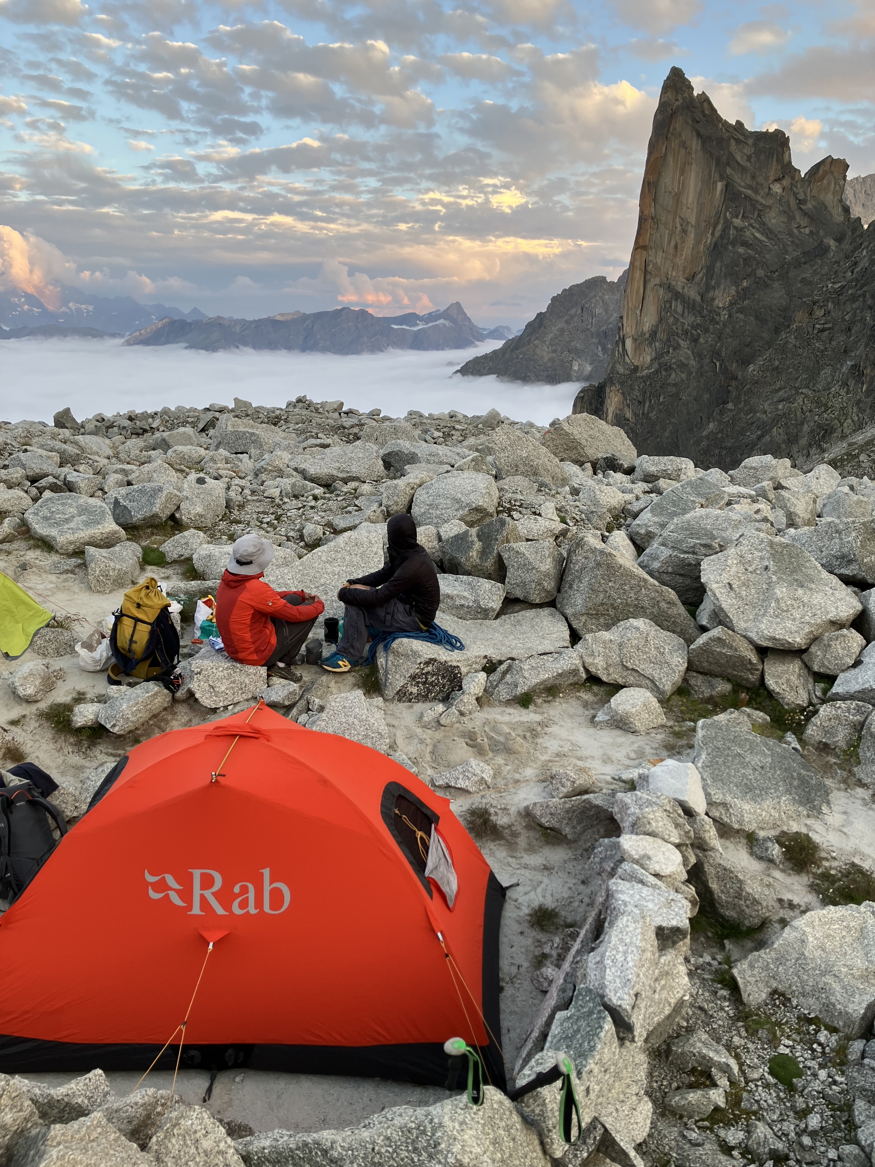 L’approche depuis le sommet du télésiège est courte, heureusement car on s’est lâchés sur les provisions. On pose les tentes dans le sable de la moraine, c’est la plage, on peut même faire des chateaux de sable. Exactement le genre de trip dont je rêvais en cette fin d’été !