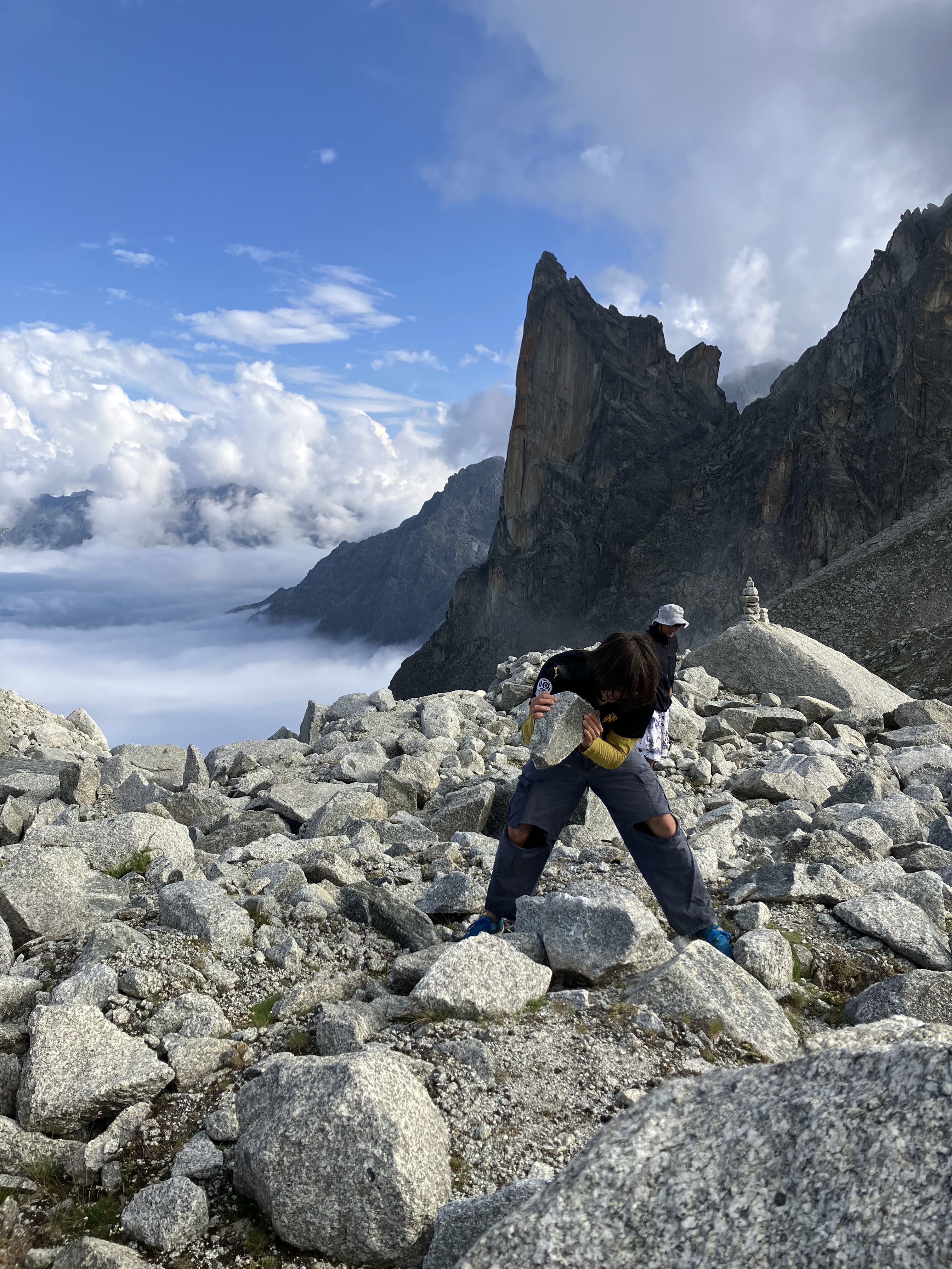 C’est la première fois que je retournais dans une grande voie. Logiquement, la deuxième journée déroule beaucoup plus et l’escalade libre y est bien plus présente. Nous découvrons la dernière longueur et le cairn qui sert de sommet au Clocher du Portalet. Pour l’anecdote, on a croisé un copain qui sortait de la face sud. Il était parti de Cham en parapente à midi: la grande classe.