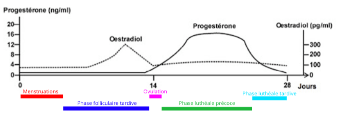 Pour rappel, on peut diviser le cycle en plusieurs phases pendant lesquelles le taux de présences des principales hormones évolue. L’estrogène a un effet neuro-excitateur alors que la progestérone génère des effets antagonistes inhibant l’excitabilité corticale (c’est à dire la force de la réponse des neurones à une stimulation donnée). Ainsi, c’est le ration oestrogène / progestérone durant le cycle menstruel féminin qui semble déterminer la capacité du corps à encaisser l’entrainement (Stitelmann et al., 2024).