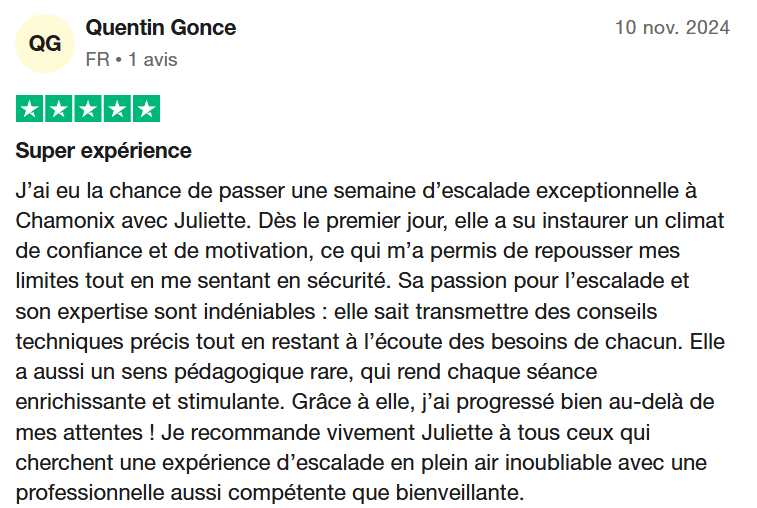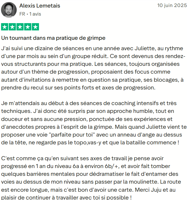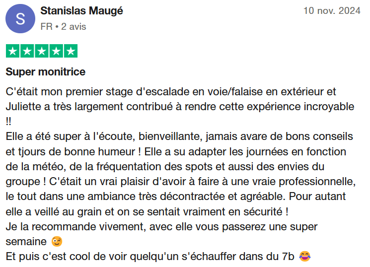Si le lien ci-dessus ne fonctionne pas, vous pouvez saisir cette adresse dans votre navigateur: https://fr.trustpilot.com/review/juliettebergmanescalade.fr